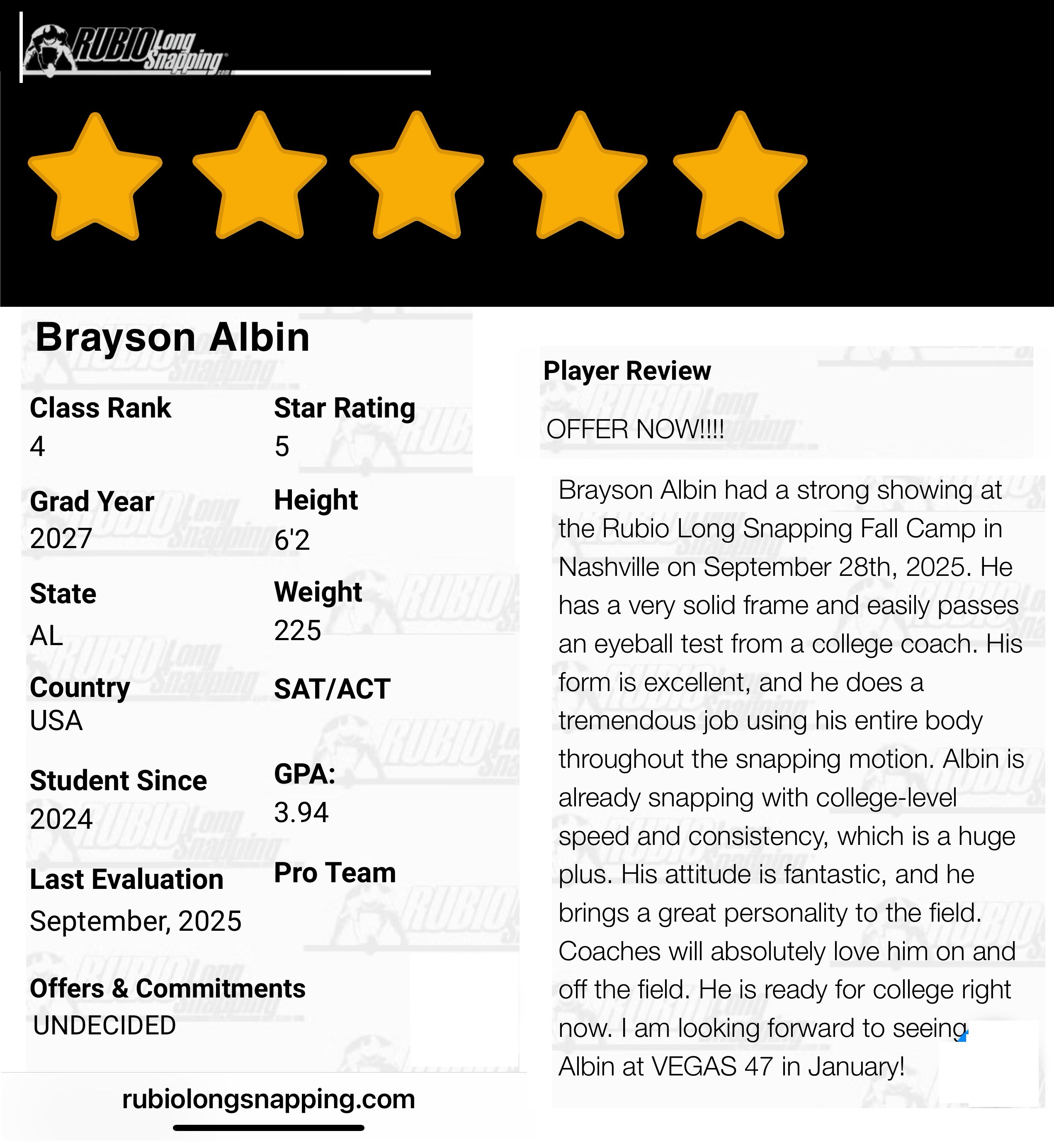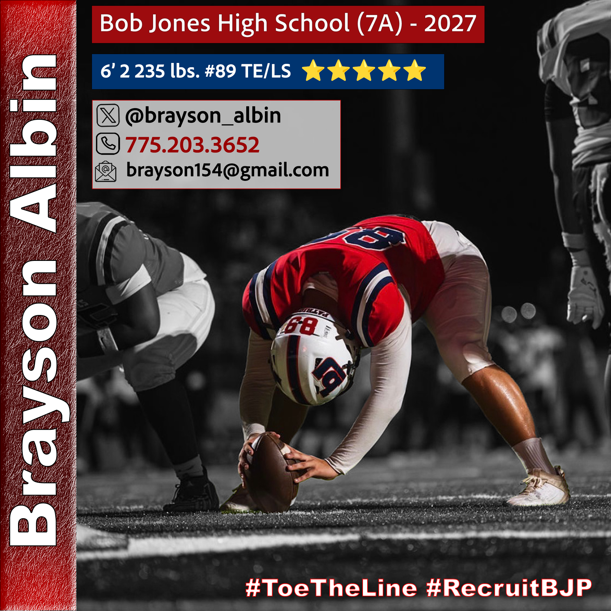 I’m Brayson Albin, a dedicated athlete at Bob Jones High School, excelling as a tight end and long snapper. My versatility on the field is showcased through my offensive play at tight end, where I specialize in blocking and making big plays. As the starting long snapper for the varsity team, I've consistently delivered accurate snaps this season, helping the team succeed. I’m always striving to improve and develop as both a player and a teammate.