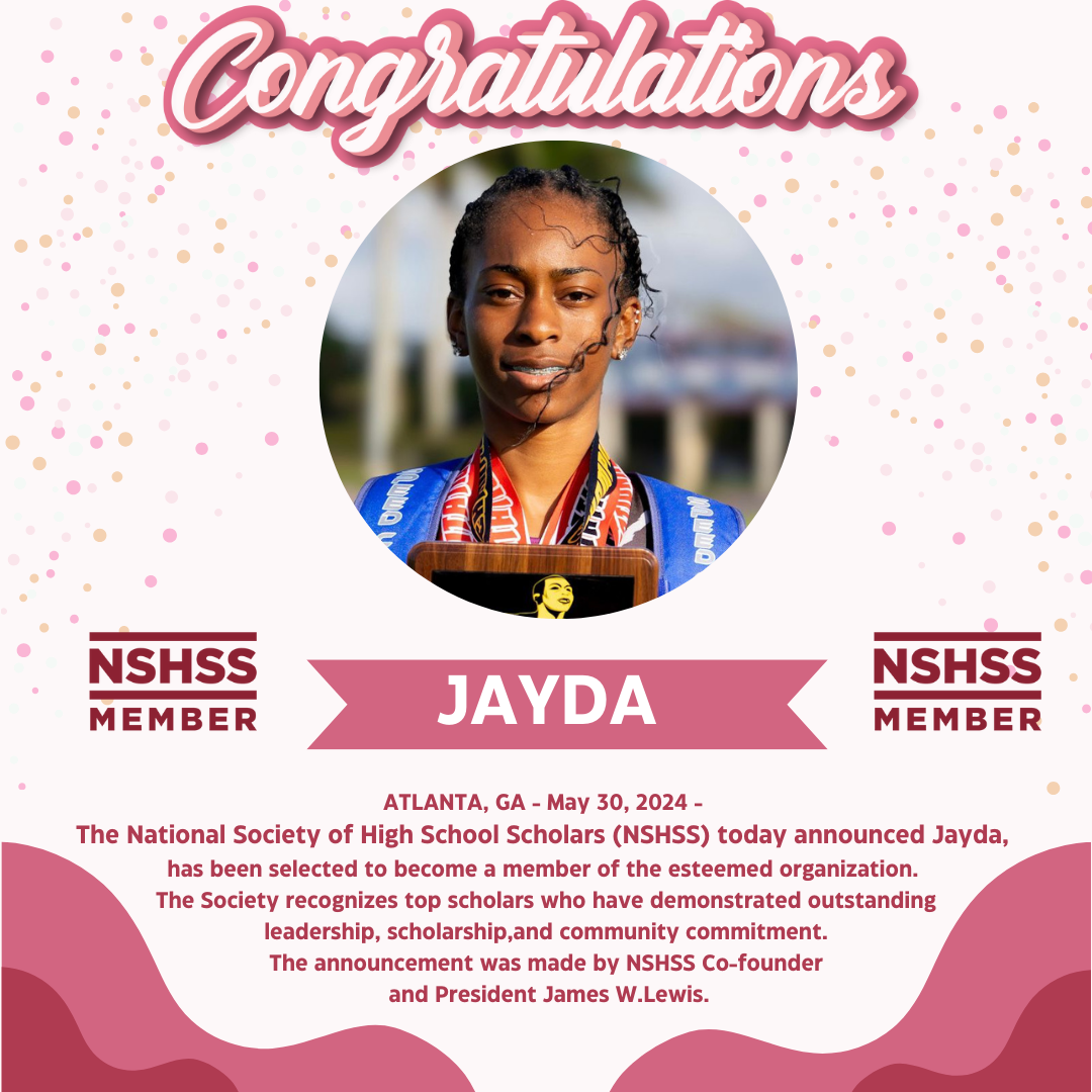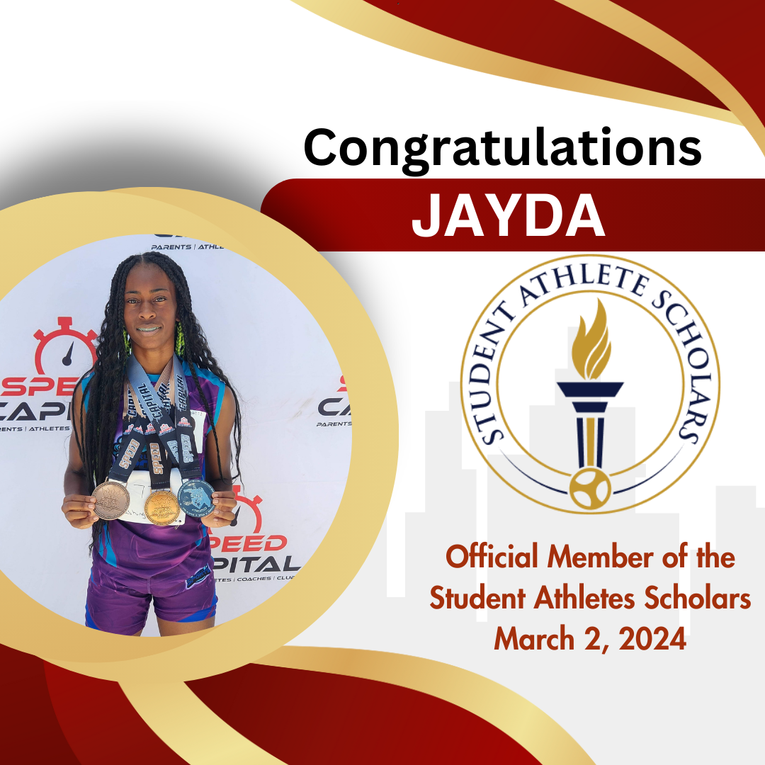 Greetings, My name is Jayda, an 11th grade scholar-athlete who is determined to be a better athlete each and every day. My speed and agility have been key assets, and I love supporting my teammates with enthusiasm and encouragement. I focus on combining practices with strength and conditioning training, a balanced nutrition, and physical therapy to become the best athlete I can be. My top events in Track and Field are the Long Jump, Triple Jump, 100m, 200m, and 4X100 relays. Currently I have completed my dual-enrollment Applied Information Technology Program at Atlantic Technical College receiving 17 Industry Certifications including Autodesk, Networking, Cloud Computing, Cybersecurity, and more. In addition, I earned my International Cambridge Diploma as a high school junior at Coconut Creek High School January, 2025.I have received several athletic awards, including: